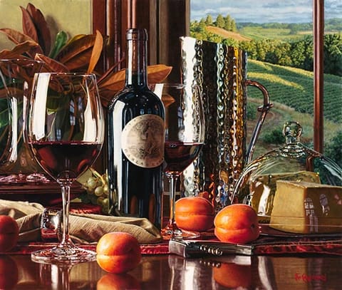 Eric Christensen is a familiar face in Napa Valley. Previously the owner of a local art gallery, Christensen closed the gallery doors in 2003 to instead devote his time to his true passion: painting. Specializing in hyperrealistic watercolor paintings, Christensen’s art often features familiar Napa Valley scenes—still life paintings with bottles of cabernet, the warmth of a tasting room fireplace, and fresh-cut Californian blooms.
